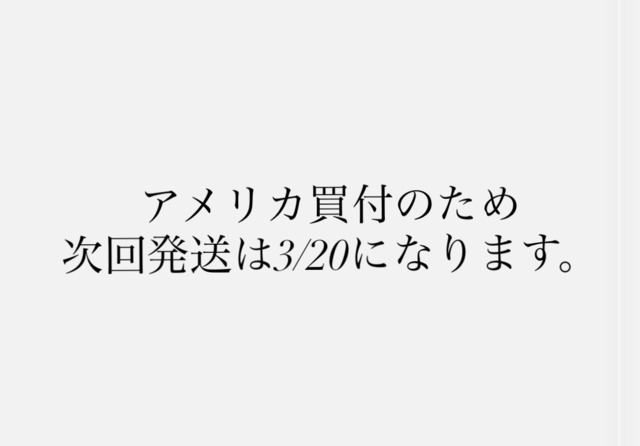 2/23〜3/19までアメリカ買い付けになります。 その期間中にご購入された場合、発送が最短で3/20になります。 ご迷惑をおかけいたしますが、ご了承くださいませ。 今後ともよろしくお願いします。