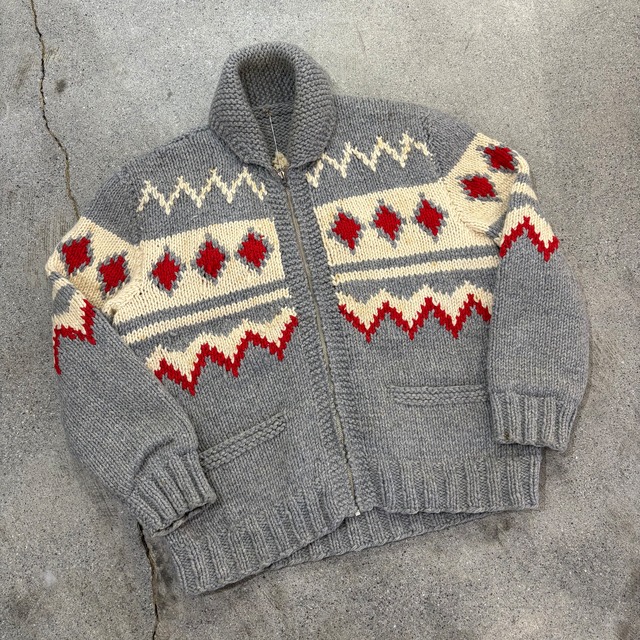 【ブランド】 Unknown 【商品説明】 60年代頃、カウチンジャケットのダイヤモンドパターンです。 当店でもお探しの方が多いカウチンジャケットですが、今回はまとめて入荷いたします。 こちらは、幾何学柄の中では人気のダイヤモンドパターンの1着です。 動物柄とは異なり、規則正しく並んだ無機質な柄はシンプルながらも主張のある着やすいパターンかと思います。 グレーボディに入る生成りのラインと、そこに織られた赤のダイヤモンドが非常に良い配色で、敬遠されがちな赤ですがとても馴染みの良いカラーリングかと思います。 ポケット付きというところも嬉しいポイントかと思います。 ゆったりしたシルエットでストレスなく着用いただける1枚です。 是非この機会にご検討ください。 【サイズ】 サイズ表記 - ※採寸値は平置き状態のものです 肩幅:約51(両肩の端から端までの直線の長さ) 身幅:約66(両脇の端から端までの長さ) 袖丈:約66(肩先から袖口先までの直線の長さ) 着丈:約75(後襟の付け根から裾までの直線の長さ) ※多少の誤差はご了承下さい 着用モデル 178cm 60kg 【カラー】 アイボリー グレー レッド 【状態】 ライニングに裂け、ところどころシミはございますが、その他目立った傷や汚れのないコンディションです。 ※ヴィンテージ商品で年代が古い為、使用感、微細な汚れ、小傷、多少の匂いなどがある可能性がございます。 完璧な状態ではありませんのでご了承ください。 ご理解頂ける方のみご購入をご検討ください。 ヴィンテージ商品に関しての小傷や汚れ、古着特有の匂いでの返品は一切お断りしております。 商品の性質としてご理解いただきますようお願いいたします。 他サイトでも出品していますので、突然売り切れとなる場合がございます。