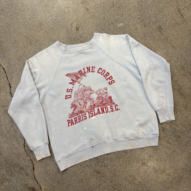 【ブランド】 Unknown 【商品説明】 70年代までのスウェットです。 当店のラインナップの中でも非常に力を入れて集めているヴィンテージスウェット。 古い物ではなかなか程度の良い物は少なく、現地アメリカでもなかなか見つからないジャンルのアイテムになります。 特にアメリカでの評価が高く、現地のディーラー達がこぞって着用しているのもヴィンテージスウェットになります。 こちらは、タグはございませんが、ディテールから70年代頃までの個体になります。 プリントは1945年硫黄島での星条旗掲揚をモチーフにされた一枚になります。 星条旗掲揚をモチーフの個体のスウェットとなると極端に数が少なく、当店では初めての入荷になります。 パリスアイランドのプリントがあることからUSMCの新兵訓練所で当時販売されていたものと思われる。 細かいプリントやボディのヤレ感も相まって抜群の一枚かと思います。 全体的変色がありますが、リアルに使い込まれてきたフェード感も相まって、クールな一枚かと思います。 丈感はヴィンテージスウェットらしいサイズ感になりますで、短丈のジャケットと合わせてもらうと抜群です。 次回の紹介が難しい個体になりますので、是非ご検討ください。 【サイズ】 サイズ表記 - ※採寸値は平置き状態のものです 肩幅:約-(両側の肩から肩までの長さ) 身幅:約56.5(両脇の端から端までの長さ) 袖丈:約52(脇下から袖口先までの直線の長さ) 着丈:約54.5(後襟の付け根から裾までの直線の長さ) ※多少の誤差はご了承下さい 着用モデル 178cm 60kg 【カラー】 ライトブルー 【状態】 ボディに変色はございますが、着用に支障のないUSEDコンディションです。 ※ヴィンテージ商品で年代が古い為、使用感、微細な汚れ、小傷、多少の匂いなどがある可能性がございます。 完璧な状態ではありませんのでご了承下さい。 ご理解頂ける方のみご購入をご検討くださいませ。 ヴィンテージ商品に関しての小傷や汚れ、古着特有の匂いでの返品は一切お断りしております。 商品の性質としてご理解いただきますよう お願い致します。 他サイトでも出品していますので、突然売り切れとなる場合がございます。