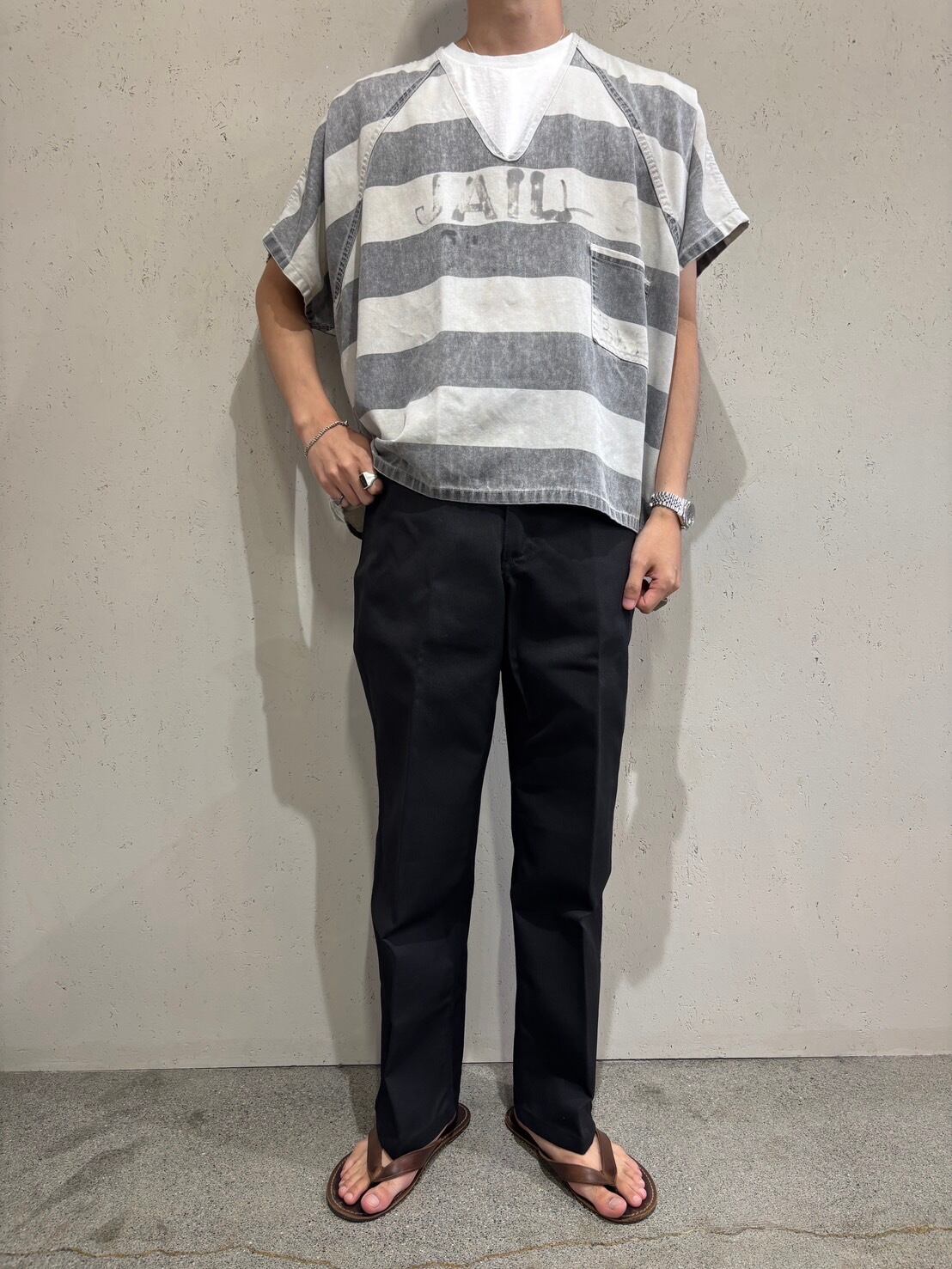 いかにも囚人的なカラーリングですが、モノクロのワイドボーダーなので、着用してみると案外バランスの良いトップスです。