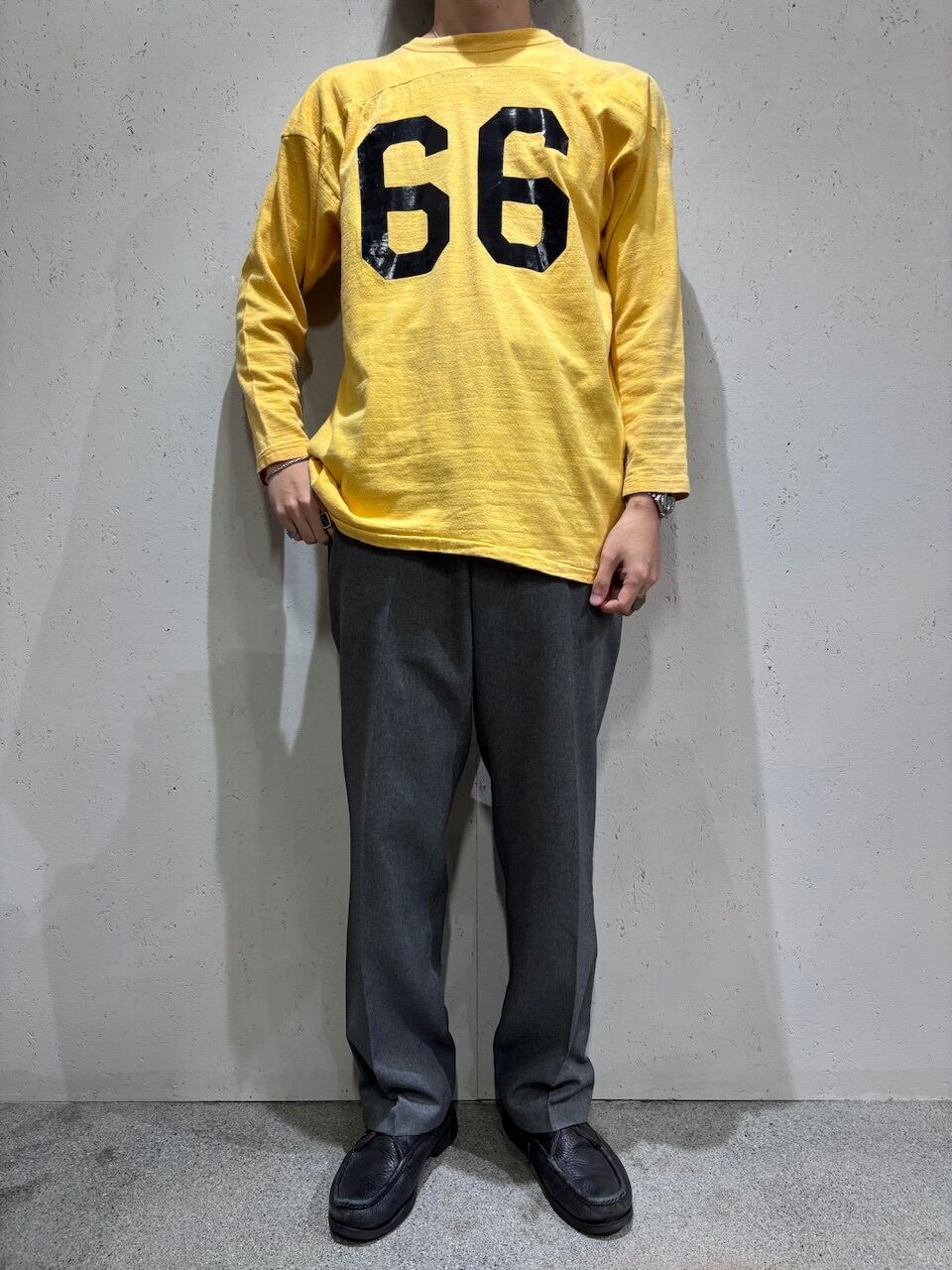 個人的には短丈のデニムジャケットやヴィンテージスウェットなどの外しとしてサラッと着てもらいたい一本です。