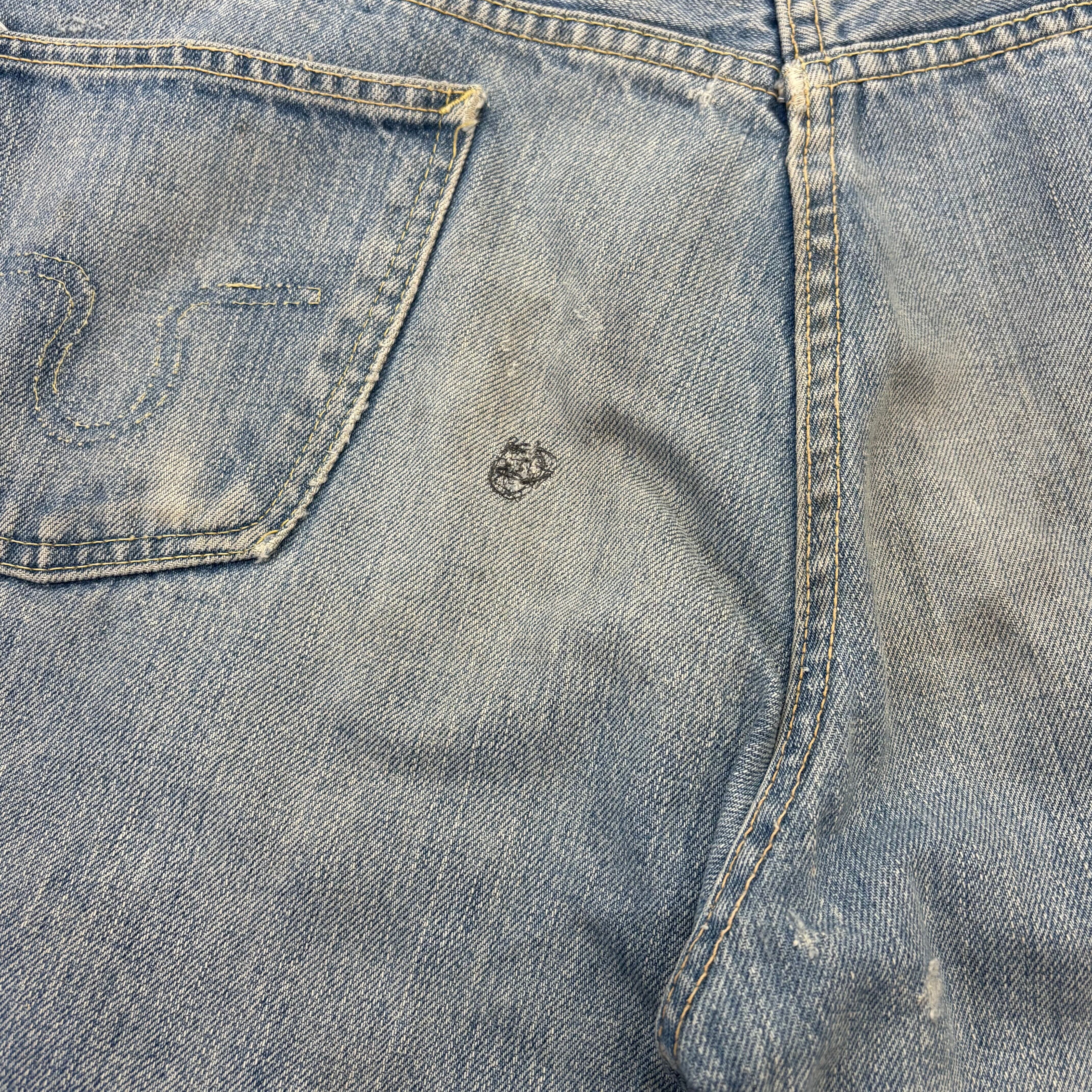 色落ちは進んでおりますが、薄いながらも前腿部と裾では色の濃淡があり、古いジーンズらしさが残っているところも良いポイントです。