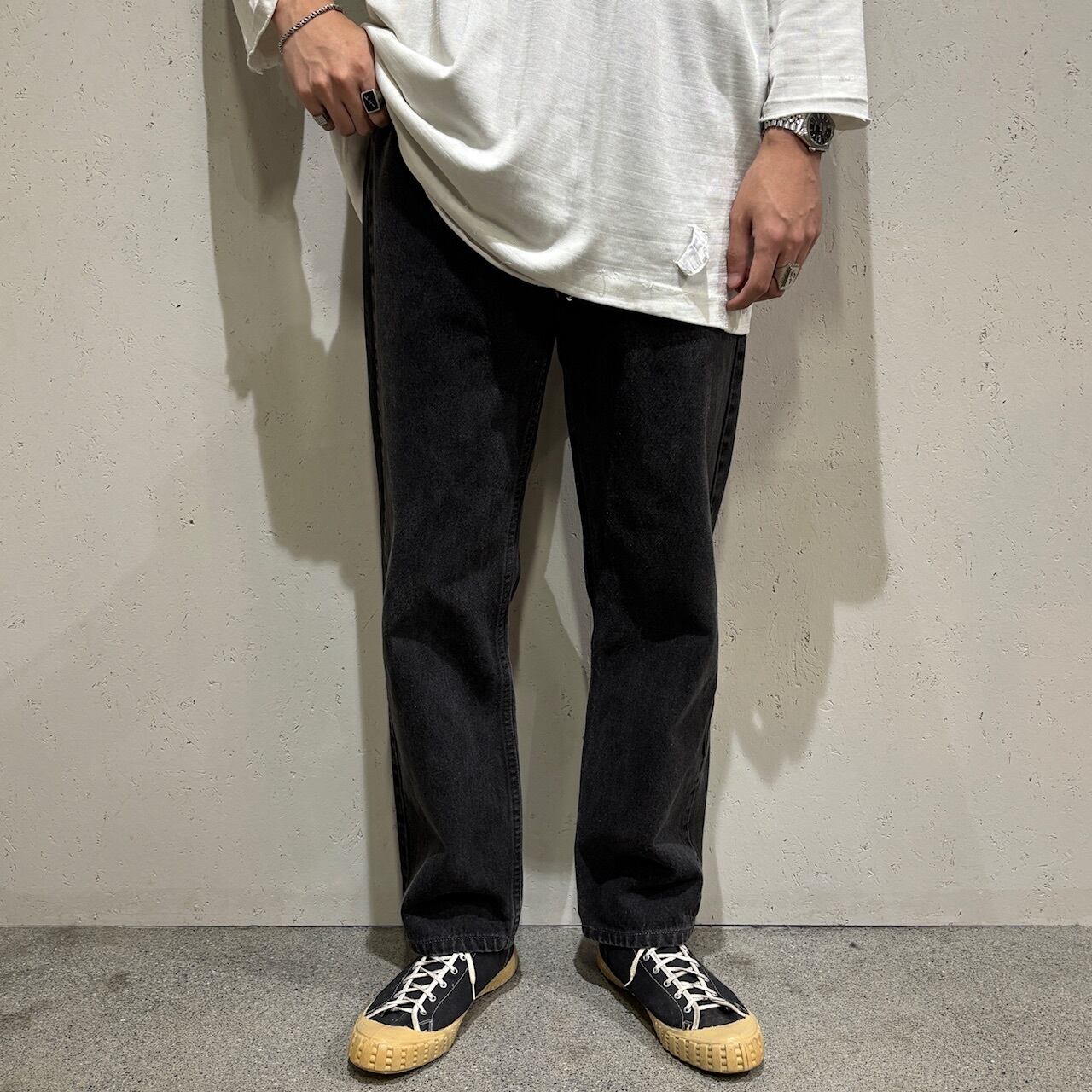 何にでも合う万能な一本で、トップスがフェードしたブラックベースのTシャツでもトーン違いでの着用が可能なので、オールブラックでも違和感の出ない組み合わせができます。