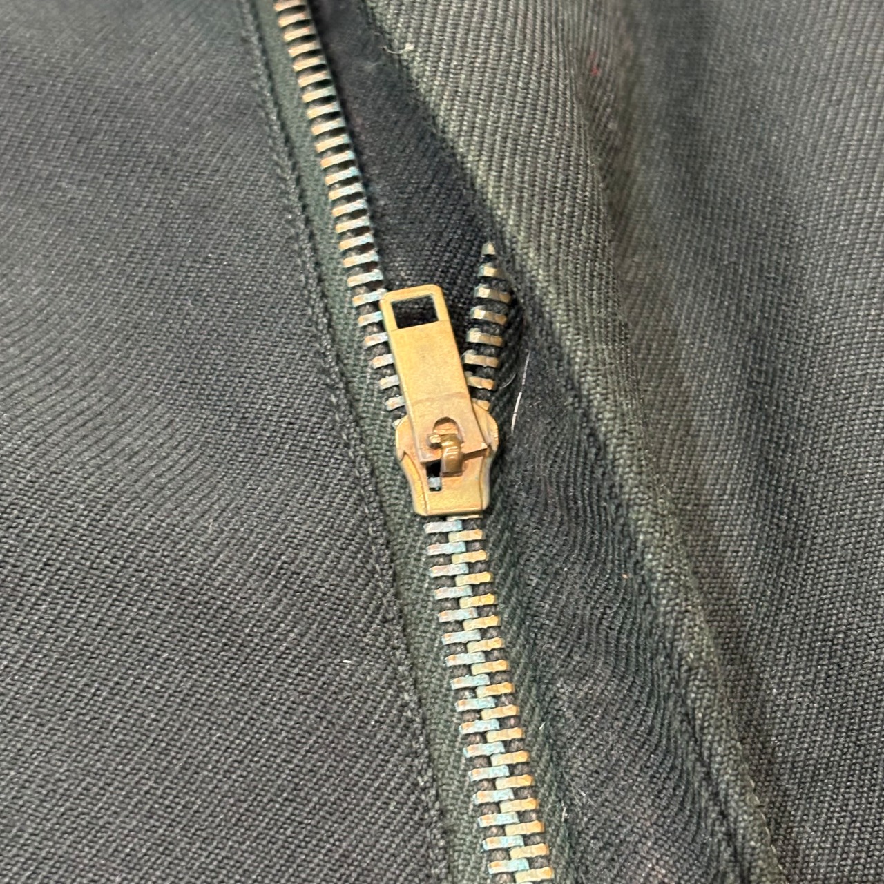 生地自体は細畝の少し光沢感のあるようなパターンですが、ダークグリーンの染料でオーバーダイが施されています。