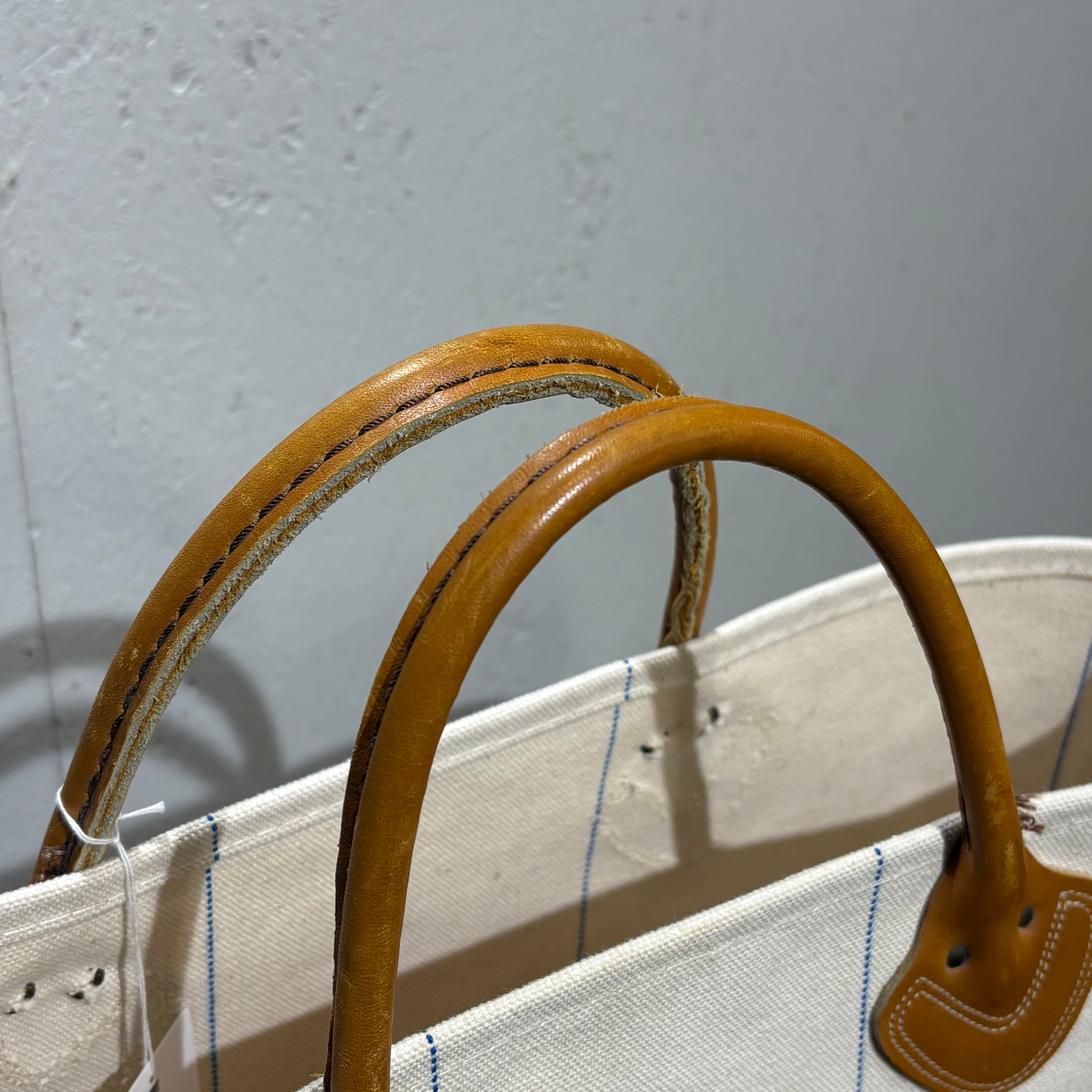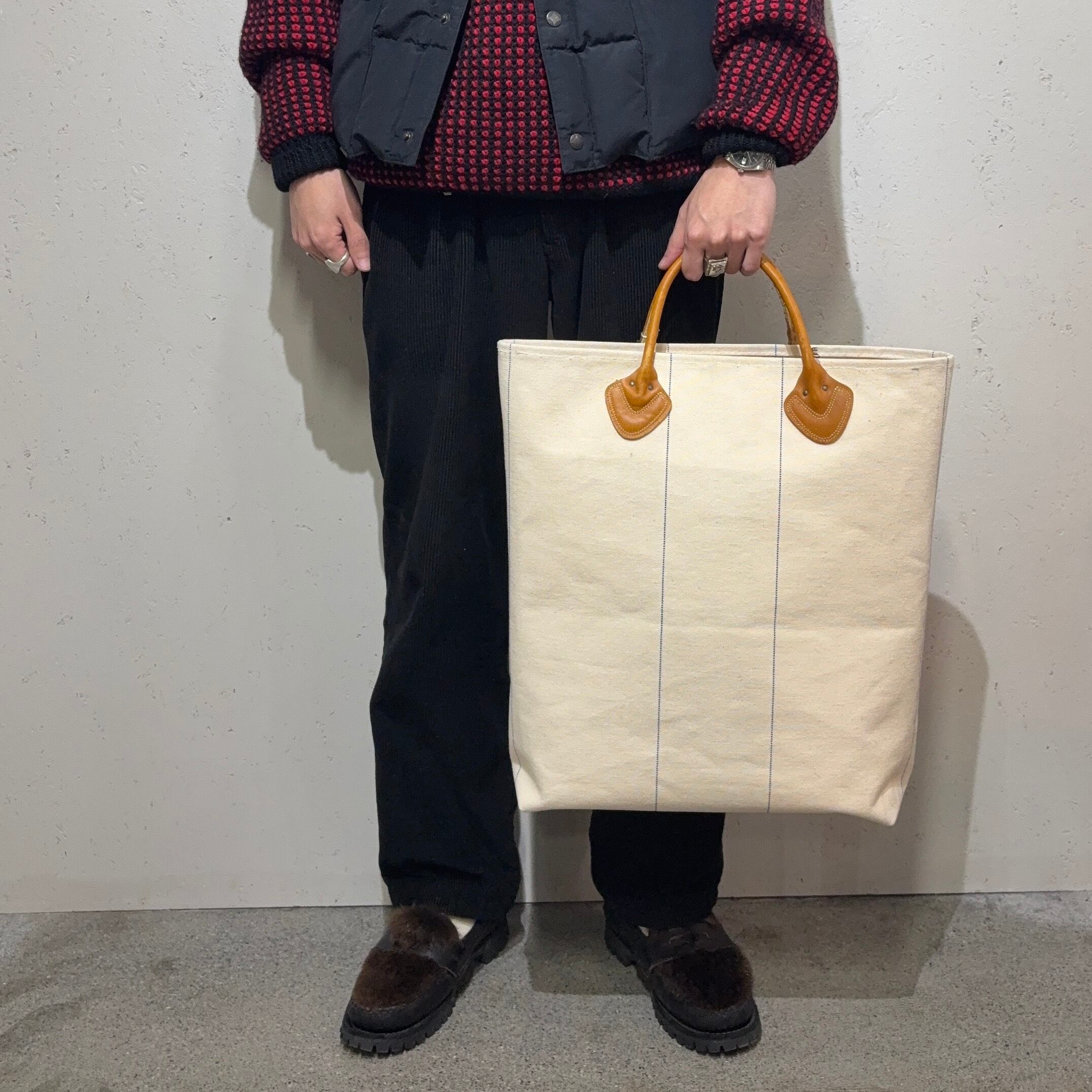 元々は薪を運ぶように作られたモデルで、スタンドにそのまま設置できるようバッグの両端は解放されているのですが、当店でトートバッグ用にカスタムいたしました。