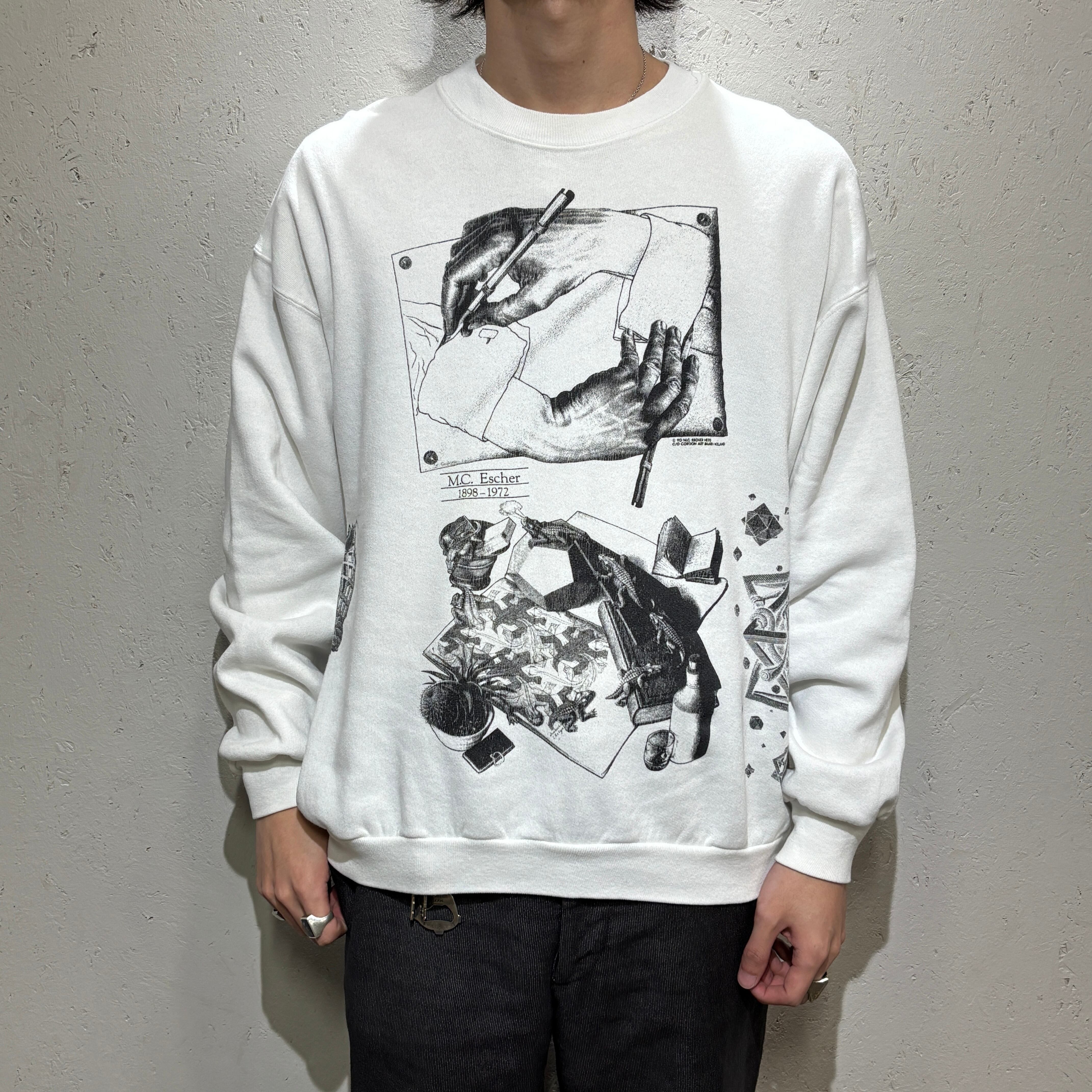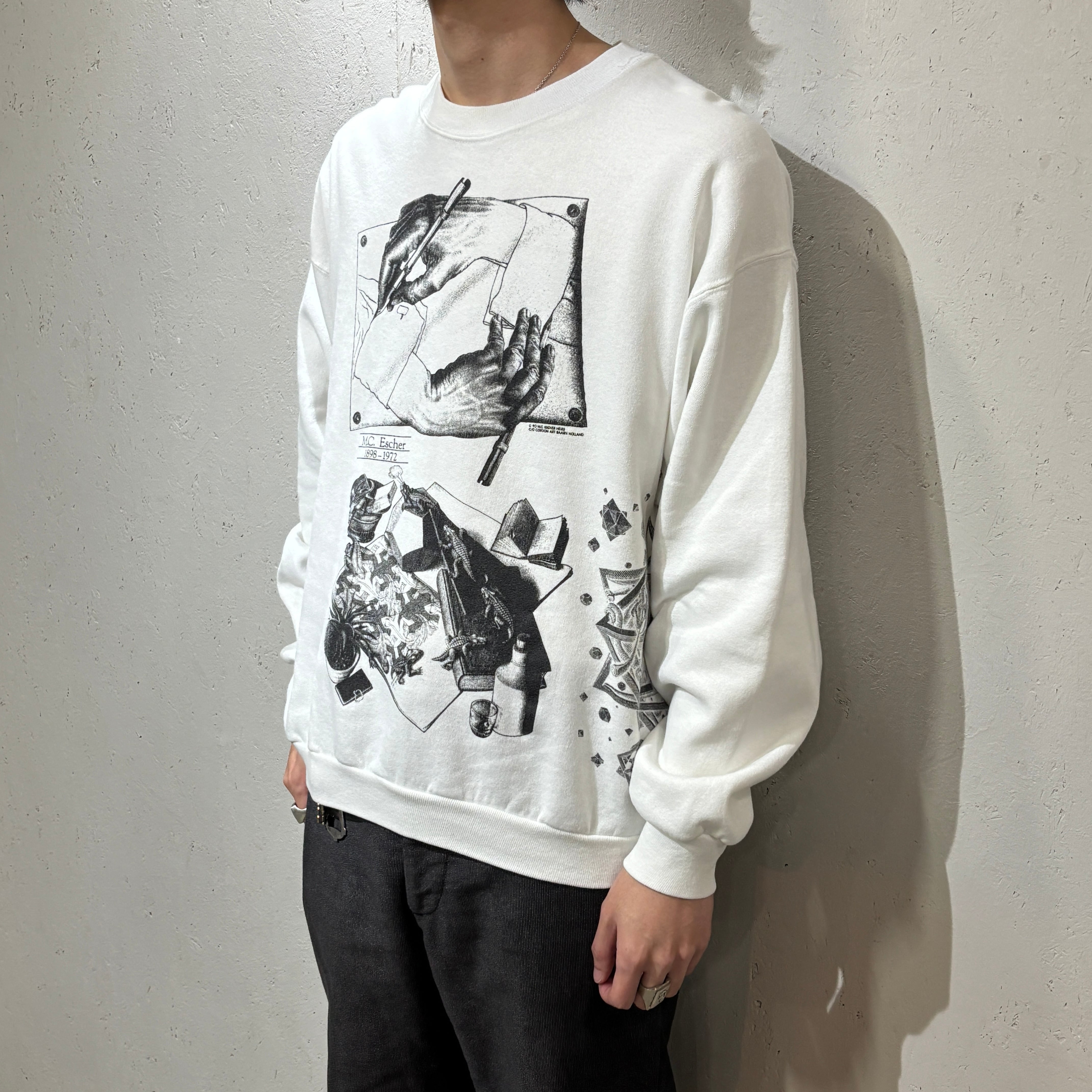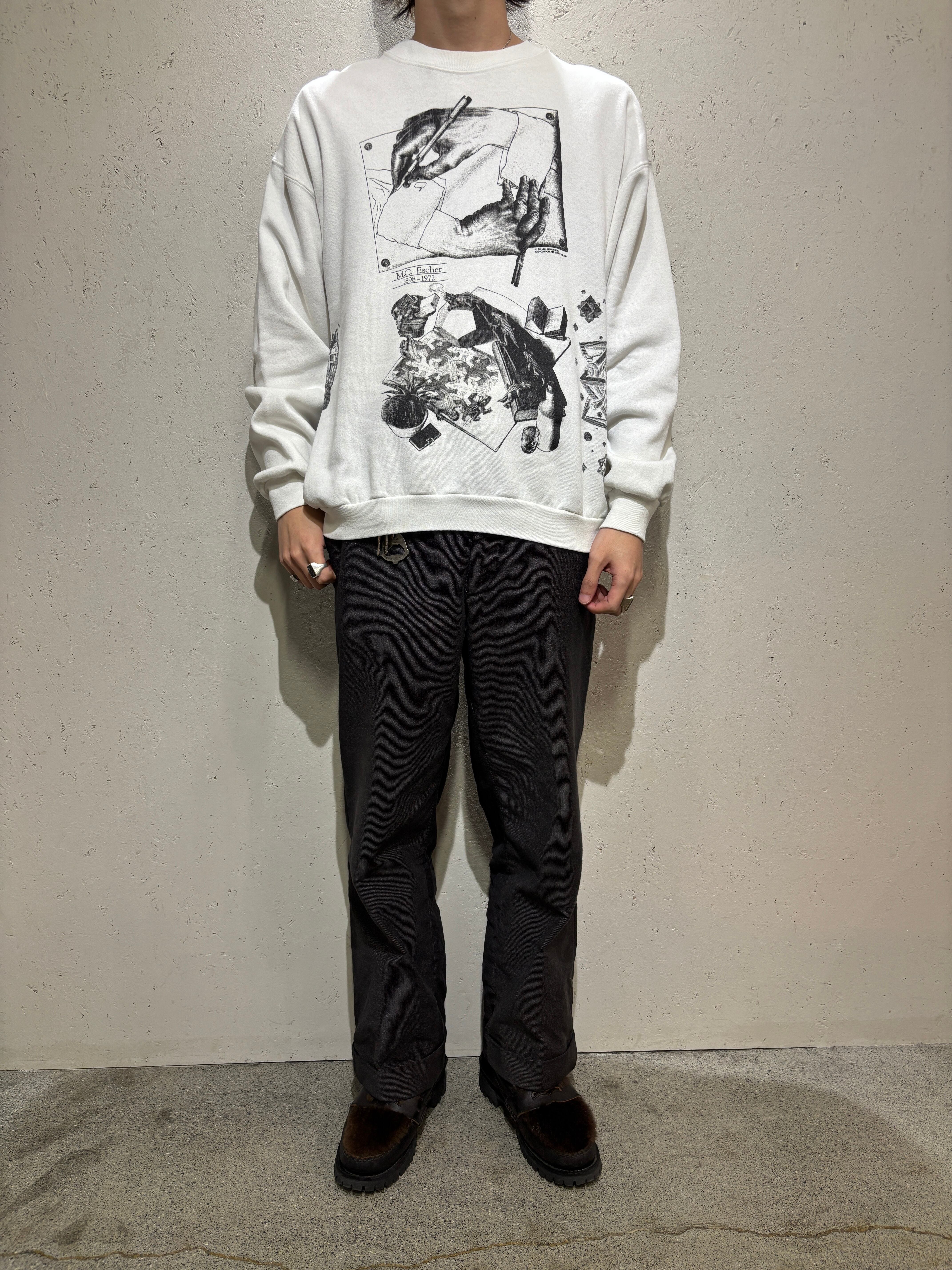 90年、エッシャーの総柄のスウェットです。