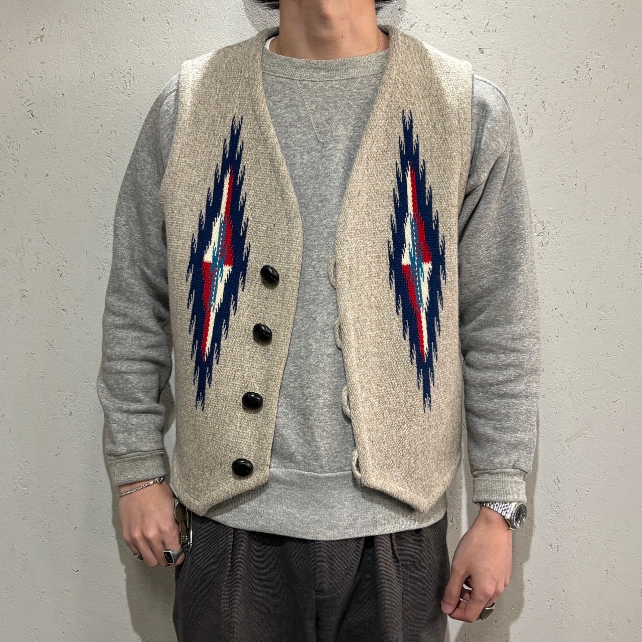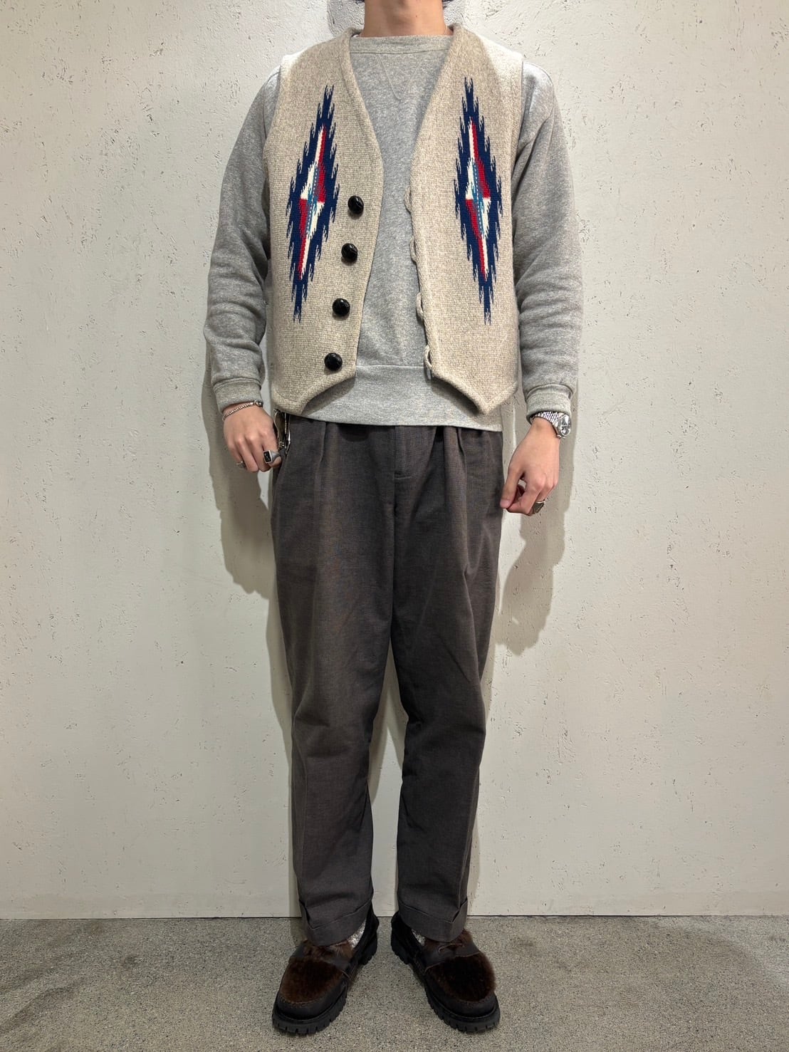 こちらの1点は、ベーシックなオートミールカラーに特有の模様があしらわれたアイコニックな1枚です。