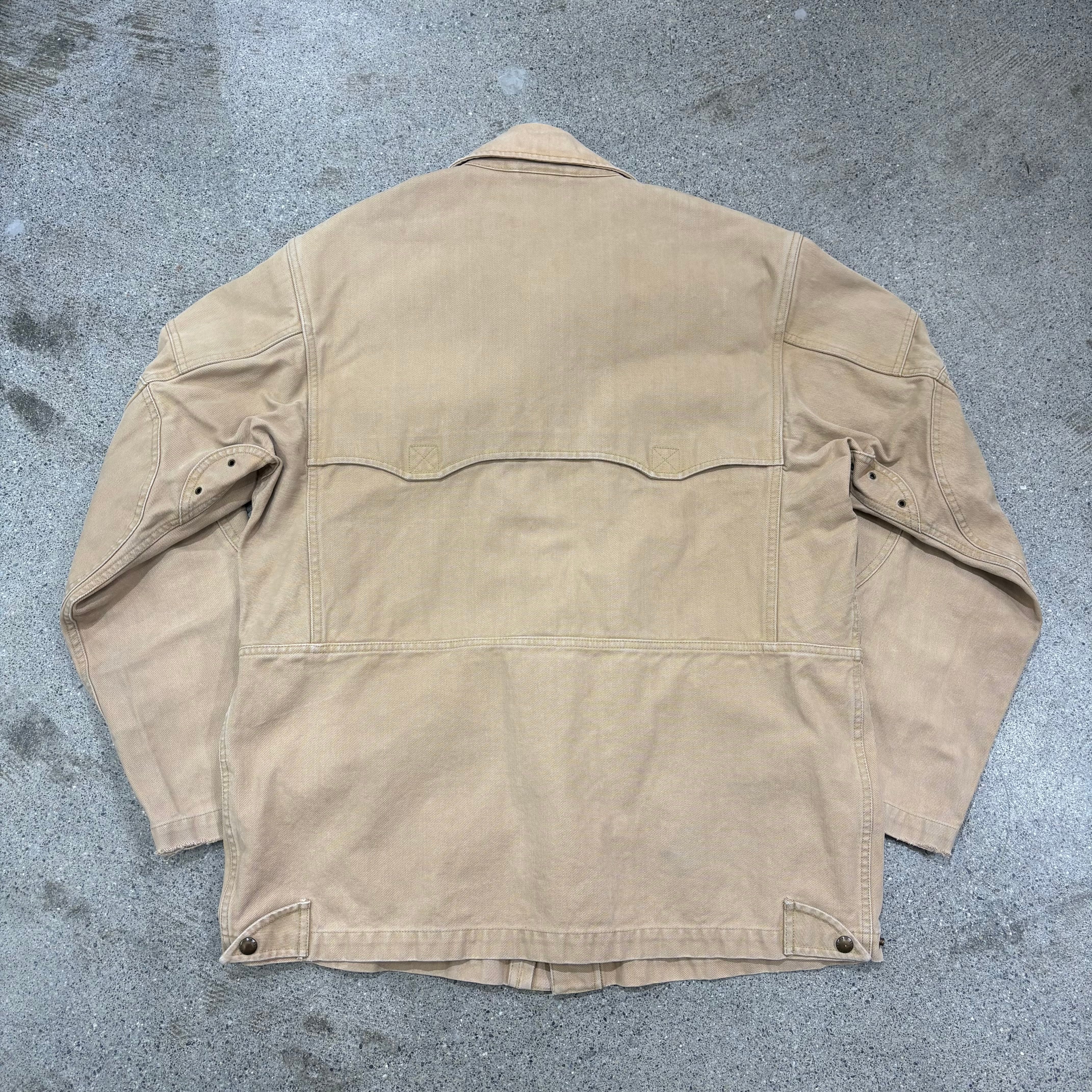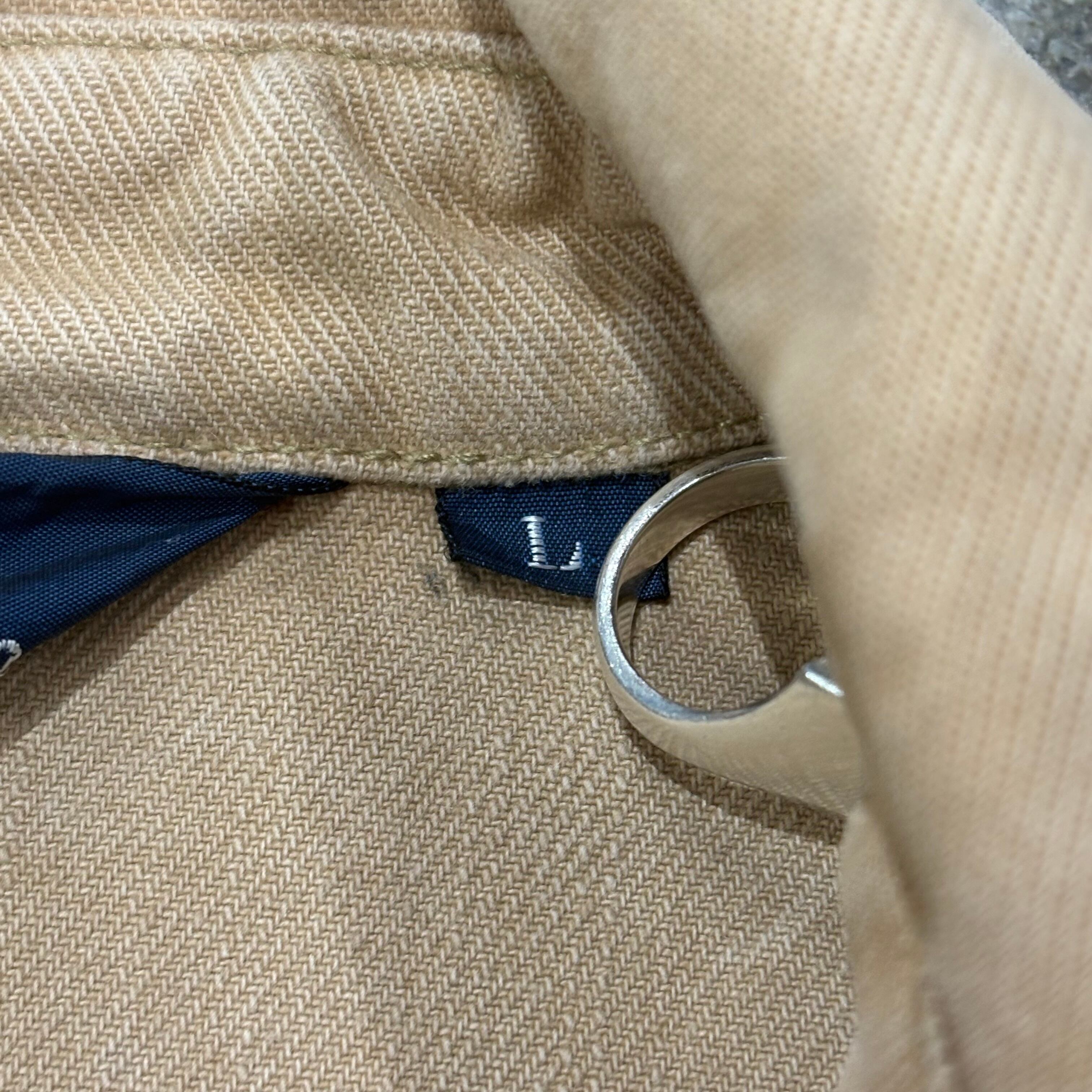 元々のオリジナルのジャケットは、分厚いオイルドクロスのようなコットンダック生地が使用されているのですが、ここは着用のしやすさ重視で、しなやかかつ重みの少ないコットンツイルに置き換えられております。