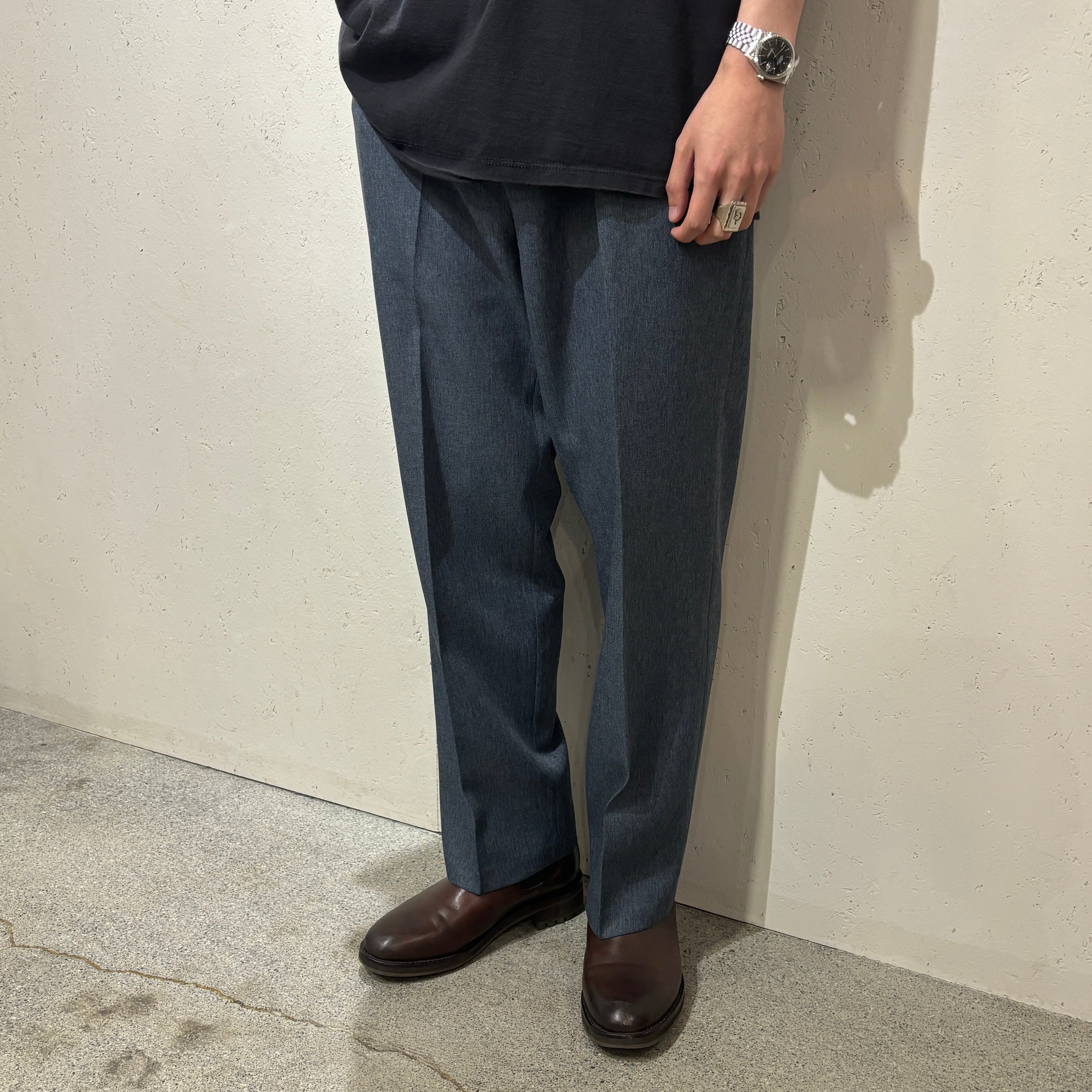 ノータックで、腰回りがスッキリとしており、スタイリッシュに見えるのもポイントで、短丈のデニムジャケットやヴィンテージスウェットなどの外しとしてサラッと着てもらいたい一本です。