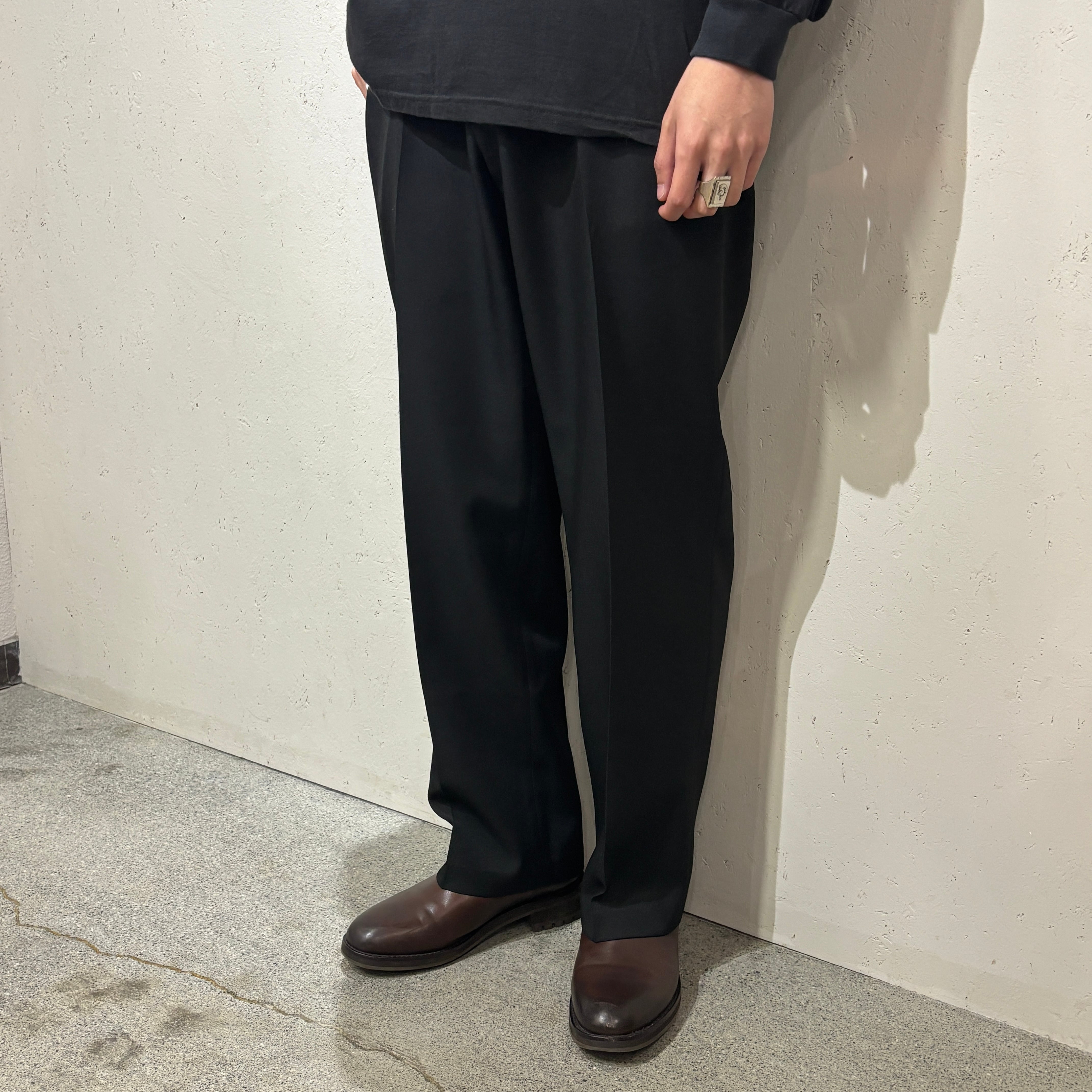 ノータックで、腰回りがスッキリとしており、スタイリッシュに見えるのもポイントで、短丈のデニムジャケットやヴィンテージスウェットなどの外しとしてサラッと着てもらいたい一本です。