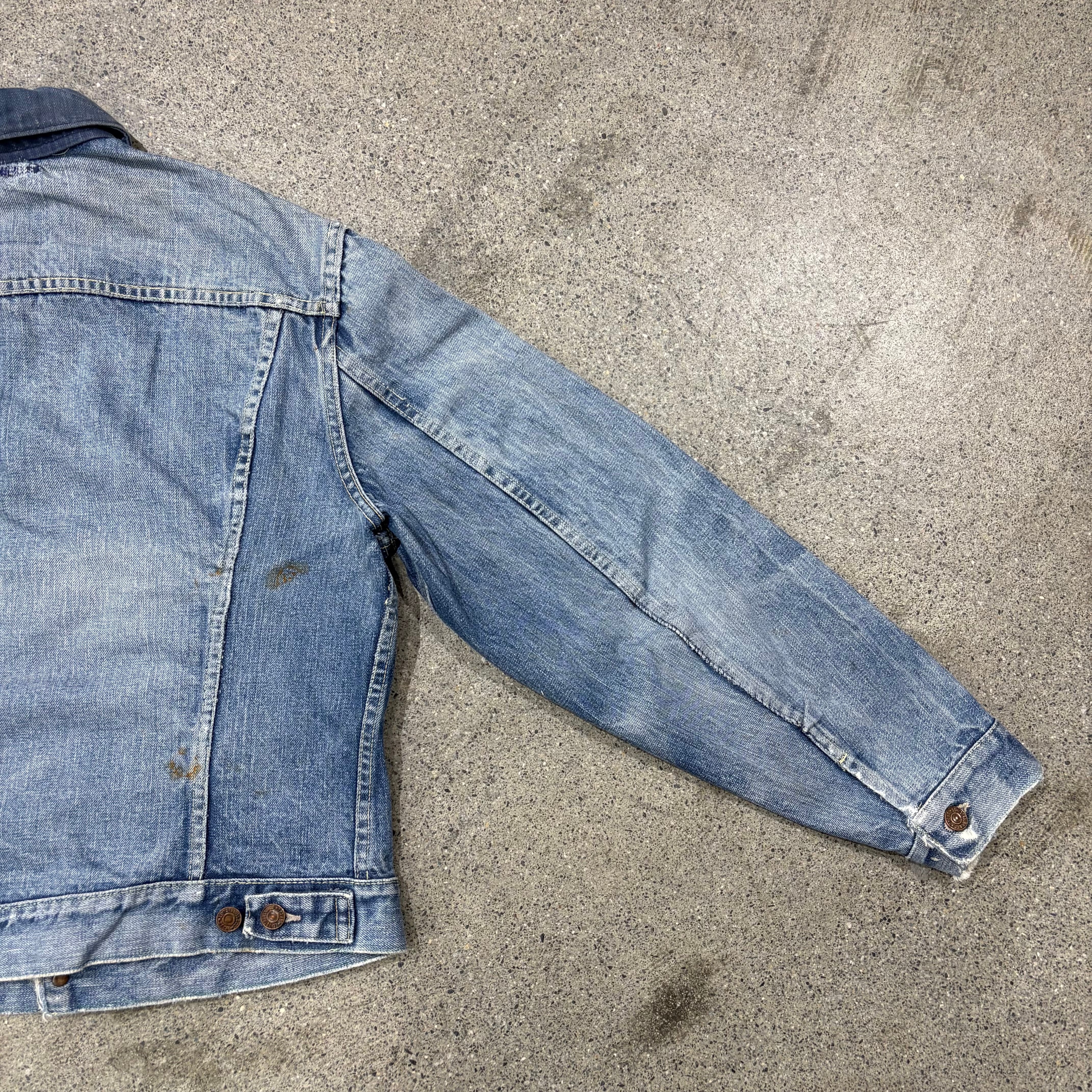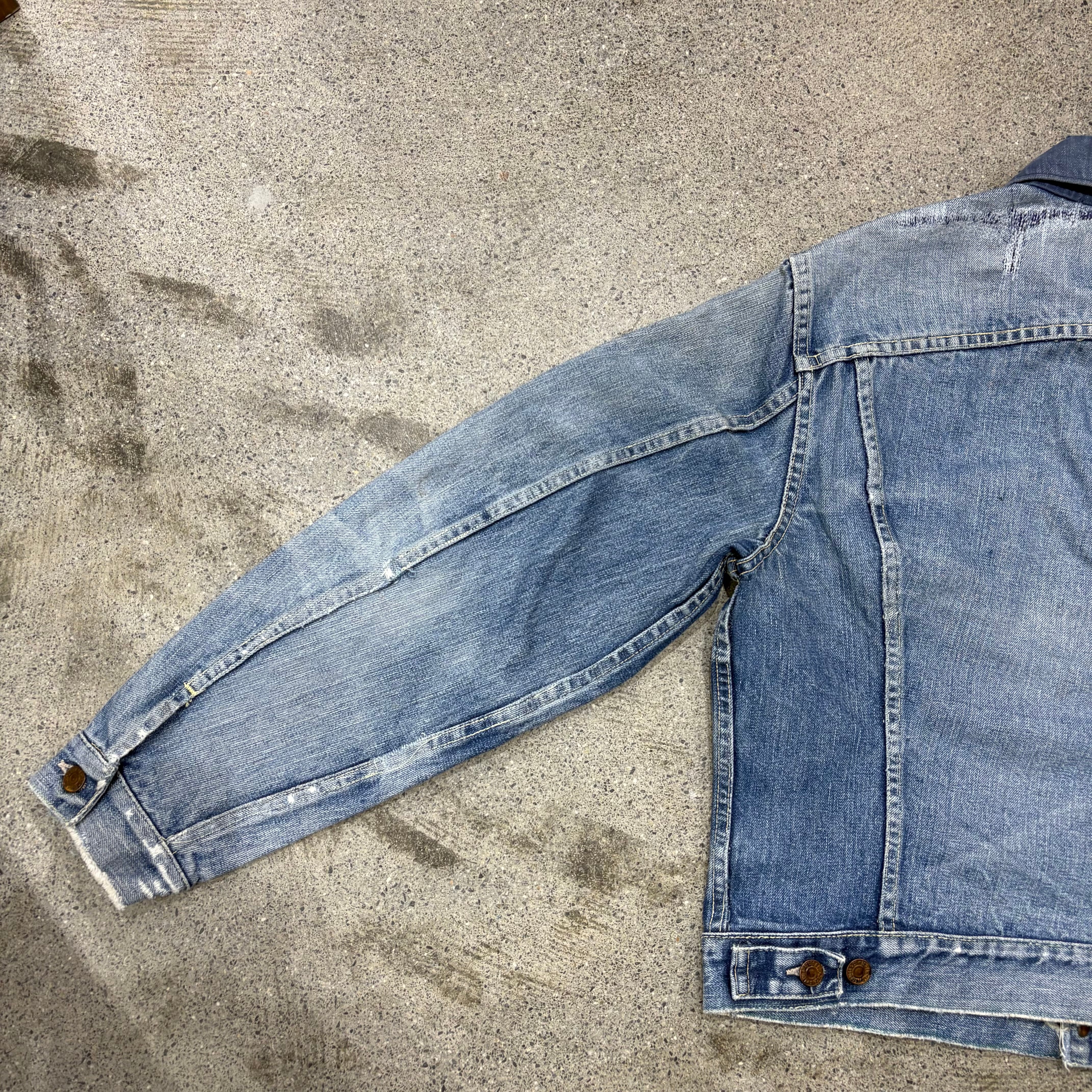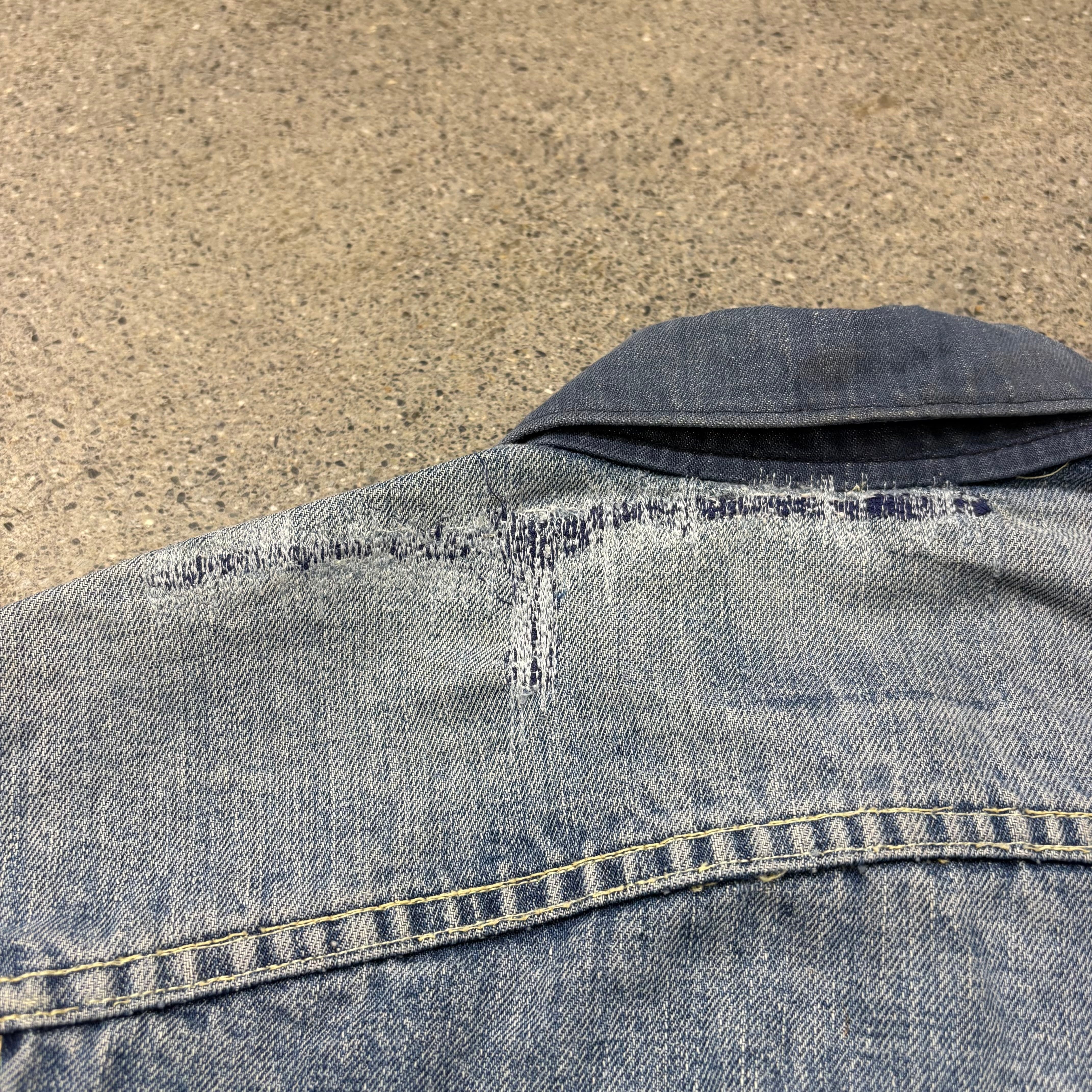 首元にリペア、襟リプレイス、背面に若干の変色、袖先にダメージ、その他袖および肩にリペアはございますが、着用には支障のないUSEDコンディションです。